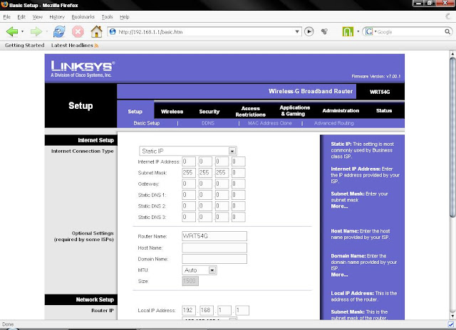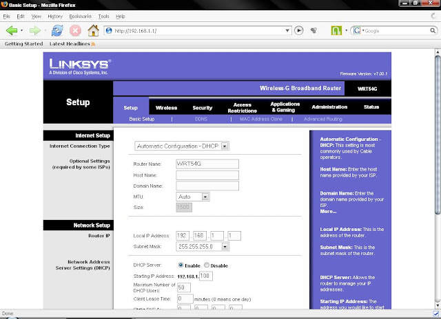 Linksys WRT54G merupakan Broadband Router yang dilengkapi dengan wireless b/g. WRT54G dapat dijadikan sebagai server gateway untuk koneksi internet anda, umumnya yang berkonseksikan "broadband internet access " atau yang sering kita sebut sebagai "Wireless Fidelity" (WiFi).Berikut langkah2x untuk mengkonfigurasi router;